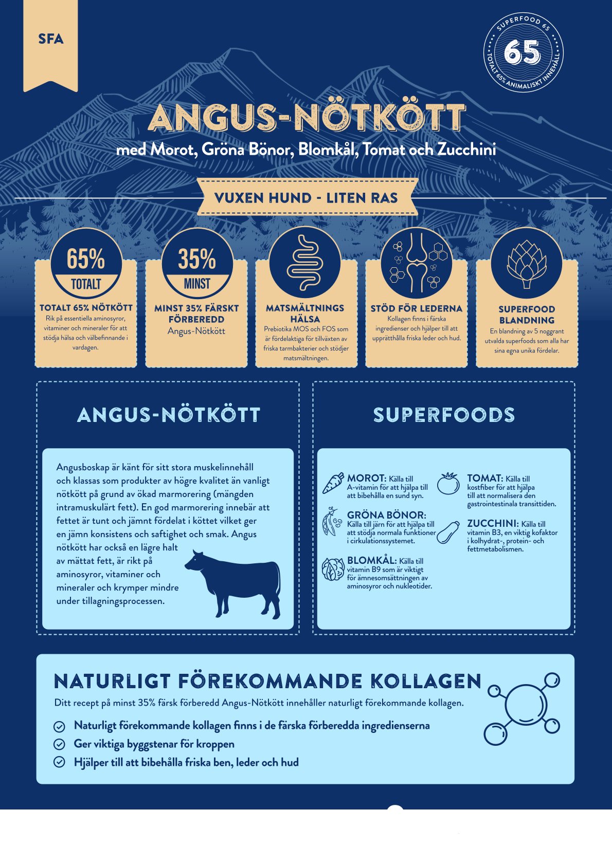 65% nötkött (35% Färsk förberedd angus nötkött, 25% torkat nötkött, 5% nötköttsfett), sötpotatis, bönor, betmassa, torkad supermatblandning* (inklusive morot, gröna bönor, blomkål, tomat, zucchini), omega 3-tillskott, mineraler, glukosamin (178 mg/kg), metylsulfonylmetan (178 mg/kg), kondroitinsulfat (125 mg/kg), fruktooligosackarider (FOS, 175 mg/kg), mannanoligosackarider (MOS, 50 mg/kg), olivextrakt (0,01%)