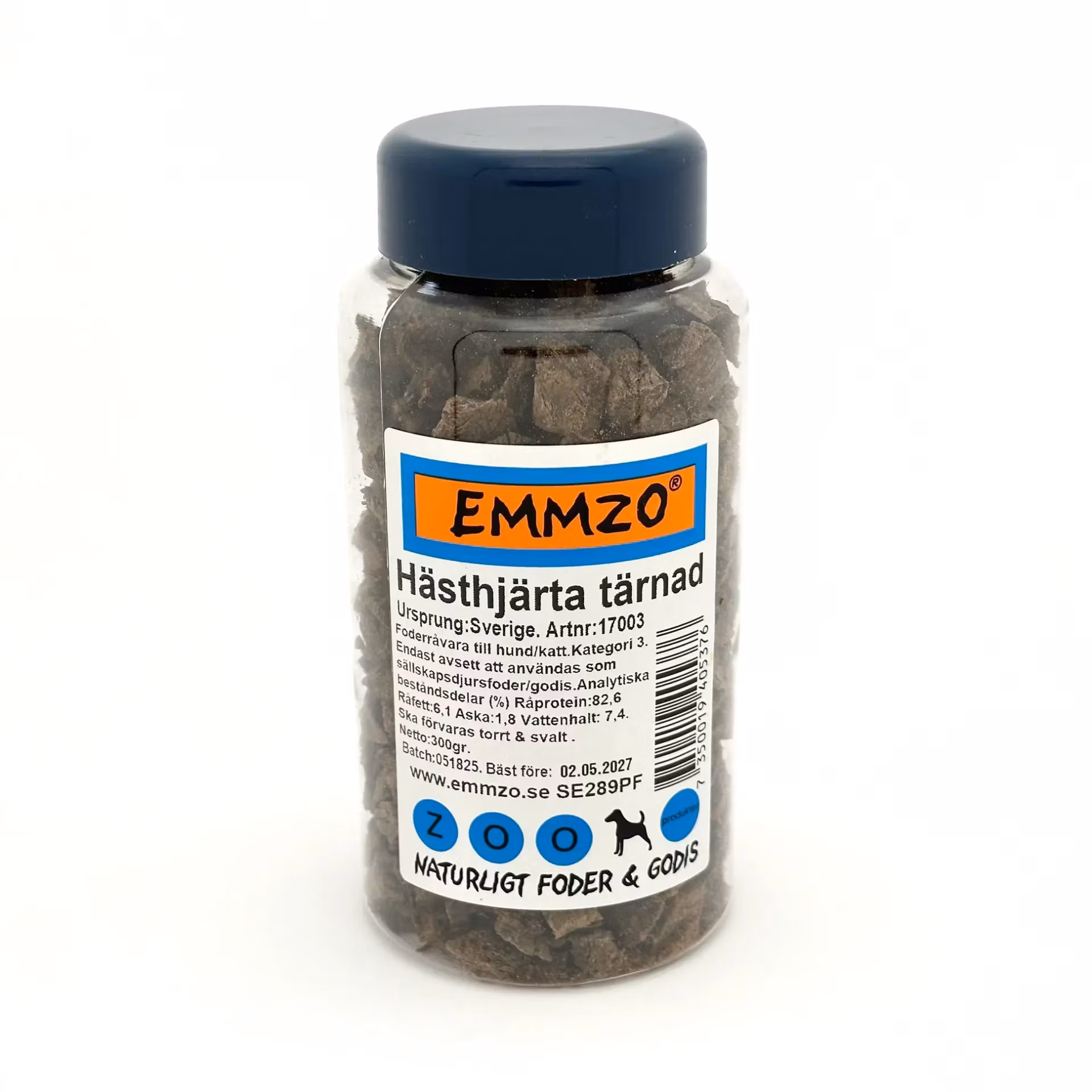 Emmzo Hästhjärta tärnad är ett naturligt hundgodis som består av torkat svenskt hästhjärta. Det är tillverkat i Sverige av svenska råvaror och säljs i återförslutningsbar (burk) förpackning 300 gram.