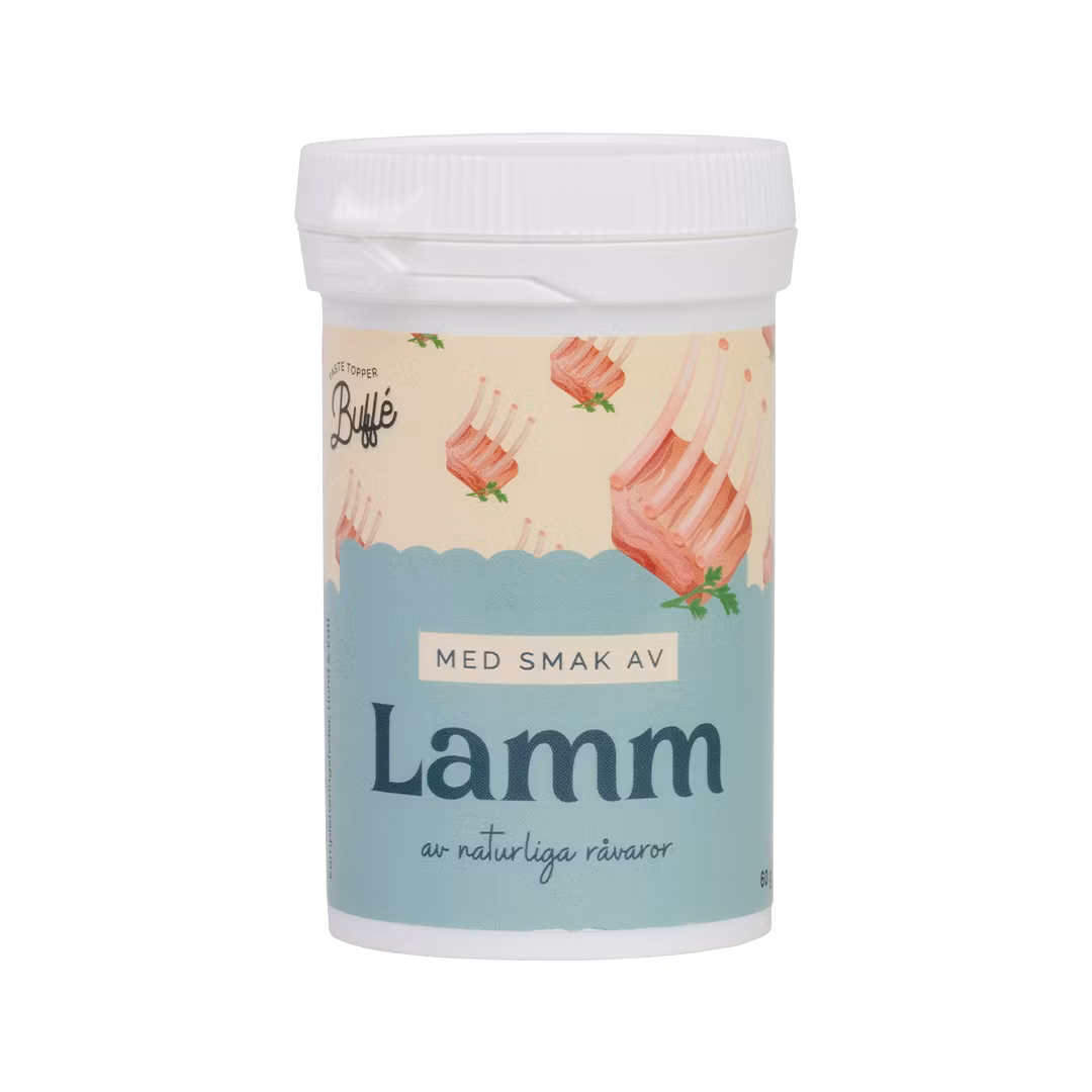 Svenska DjurApotekets Buffé Lamm är en smakförhöjare till den matkräsna hunden eller katten. Strö över fodret eller blanda med vatten för en buljongkänsla. Vill du att din hund eller katt ska dricka mer vatten kan du addera Buffé Toppers för en smakrik vattenskål!